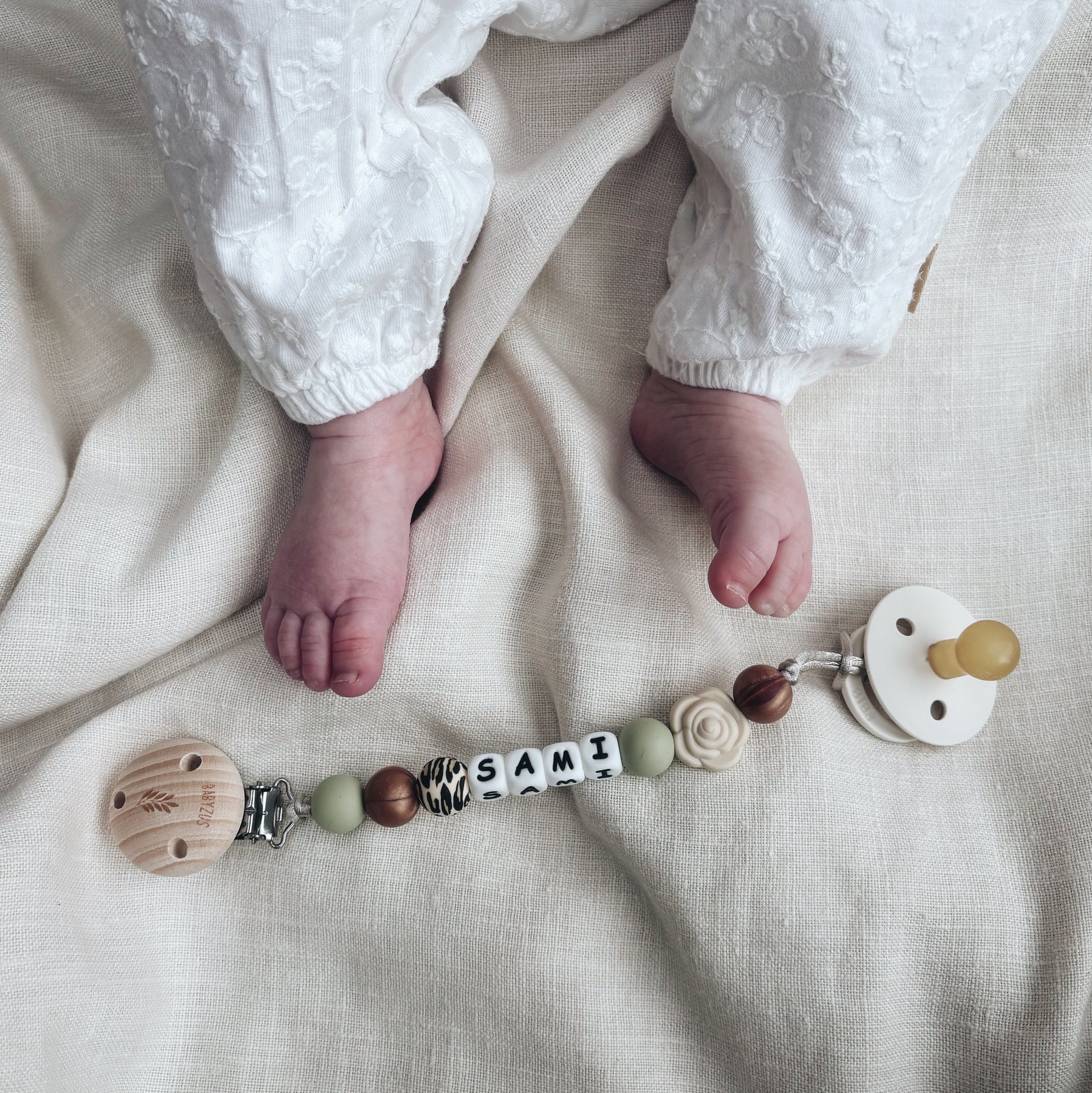 - Die Zusammensetzung des Schnullerclips kann sich ändern, wenn die Länge des Namens länger als 5 Buchstaben ist. Dies, um innerhalb der maximalen Länge zu bleiben. Wir versuchen immer, den Stil des Schnullerclips beizubehalten!